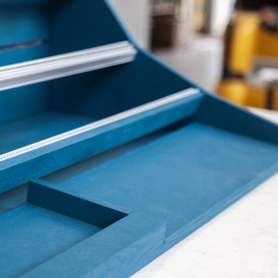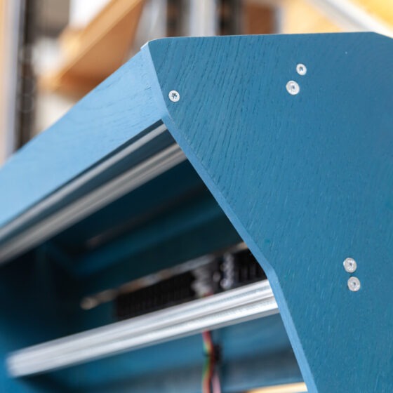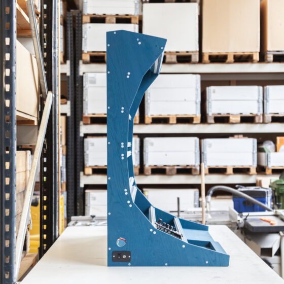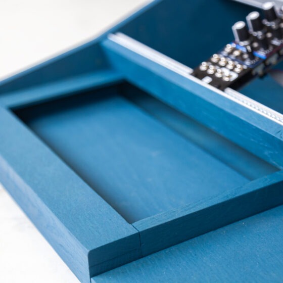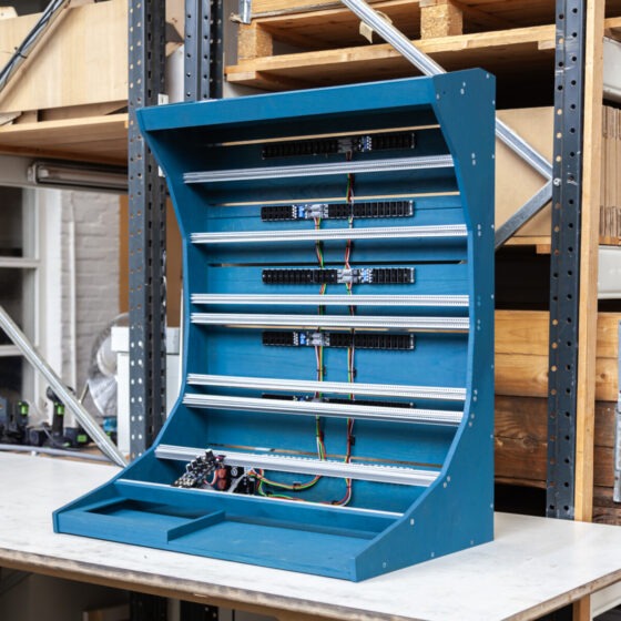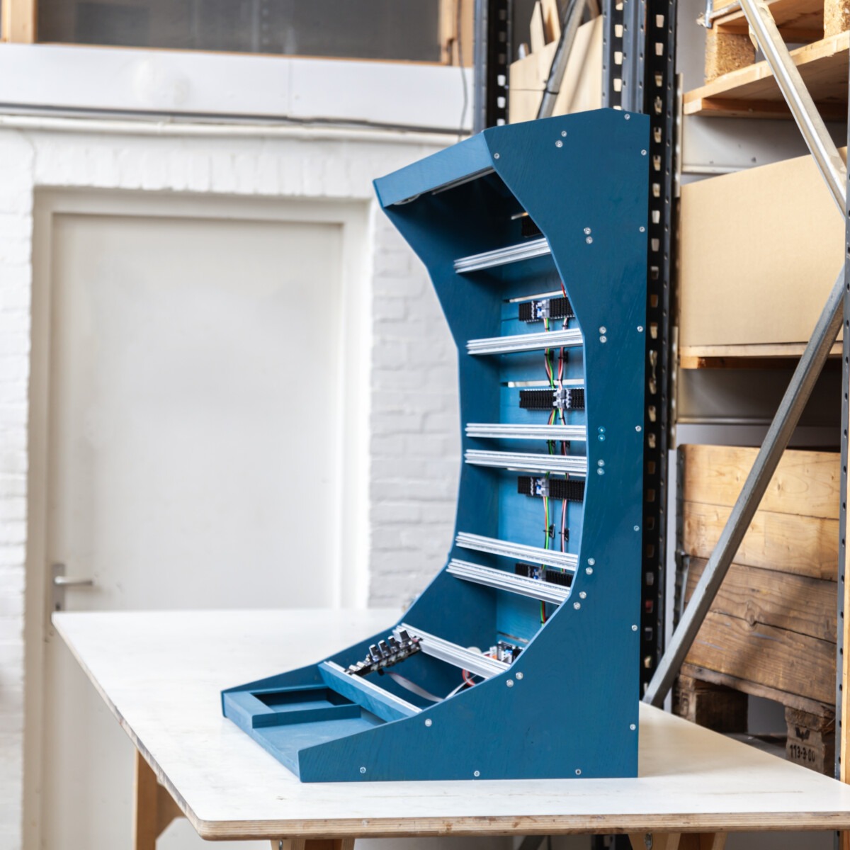 A 20U 140HP Eurorack case in a custom colour, with a custom shape (depth and height to fit the desk) custom width to have space for a Keystep Pro & a faderbank with a custom shelf to fit both and to top it off an integrated Philips Hue LED strip on top … quite a build!