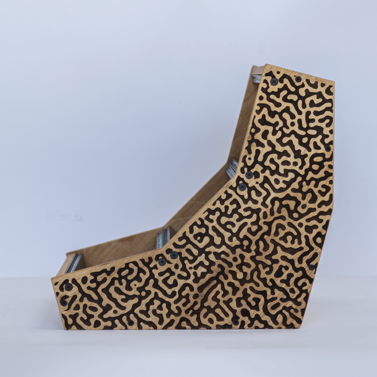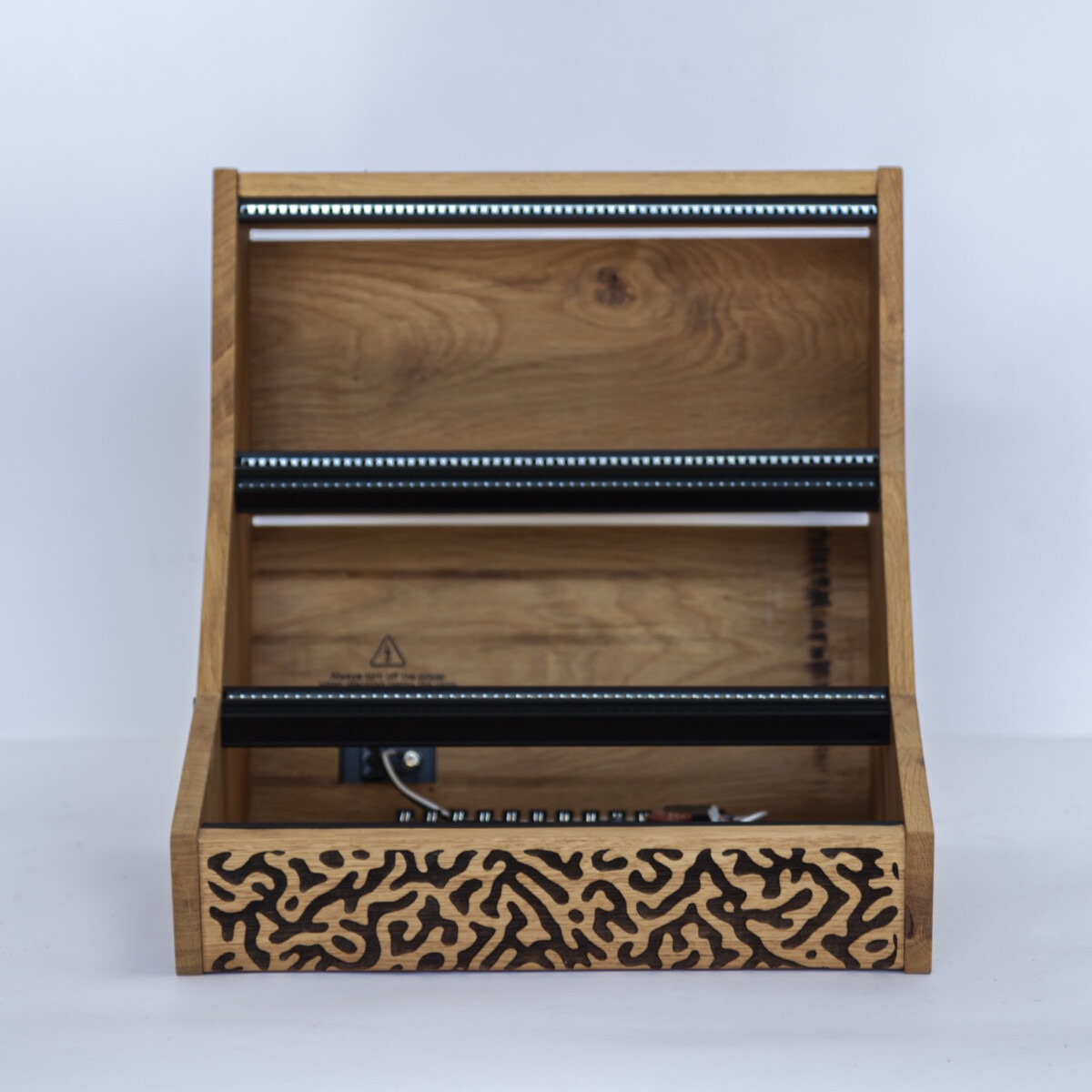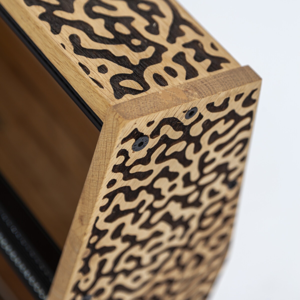 9U 60HP Eurorack case in solid oak with ‘turing pattern’