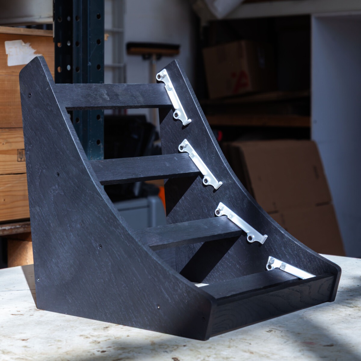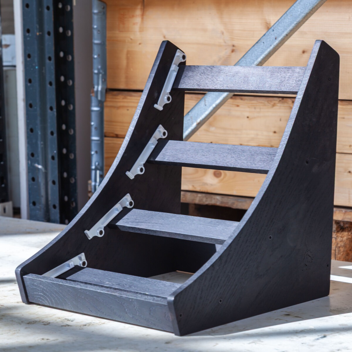 Where on the images you can see we made these in solid 12mm Oak panels, laser-cut and assembled with 3d printed brackets (colours can deviate).